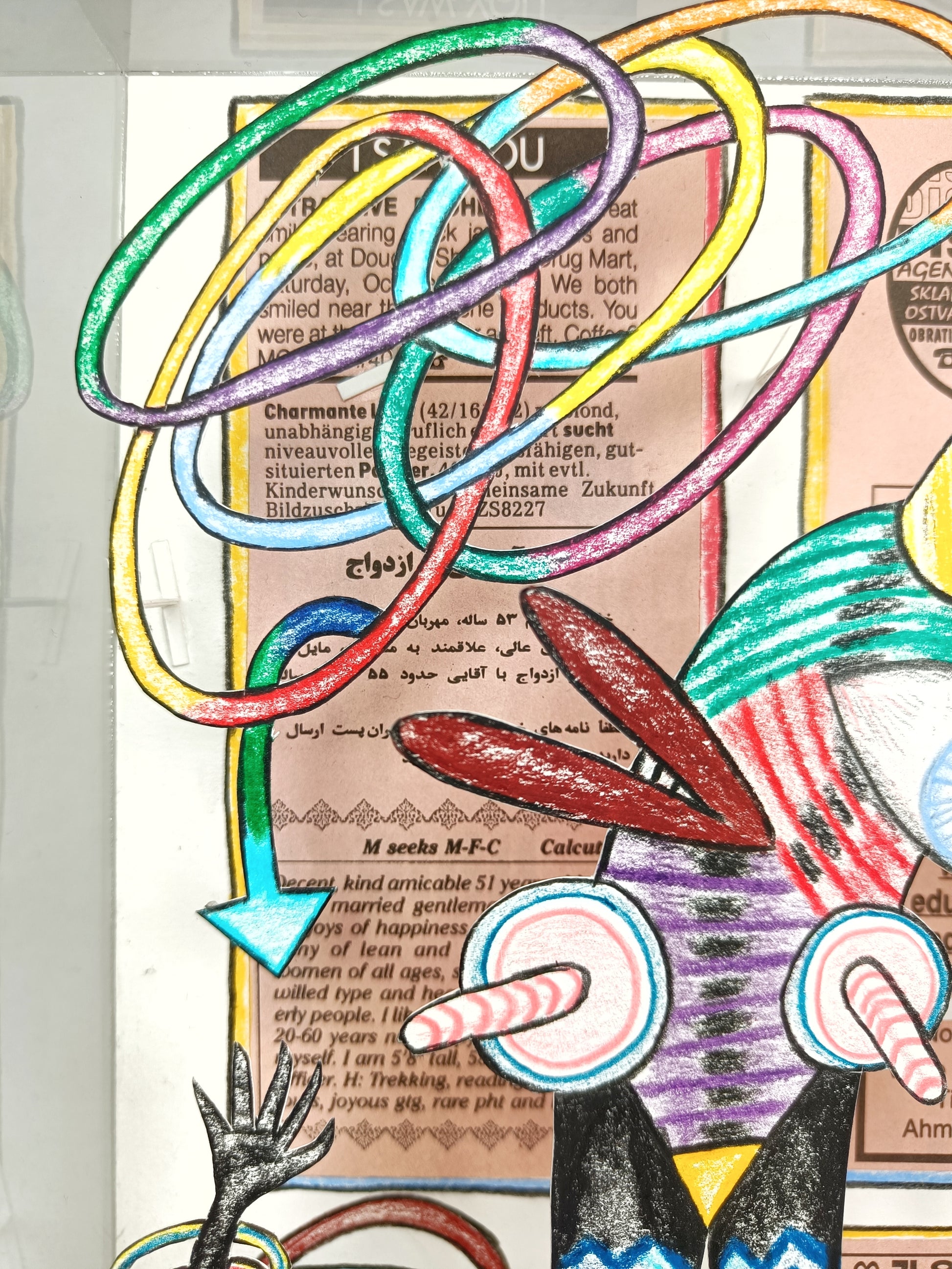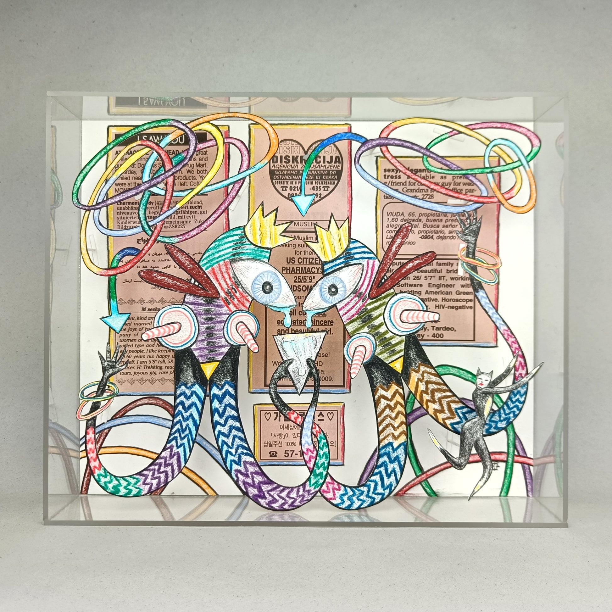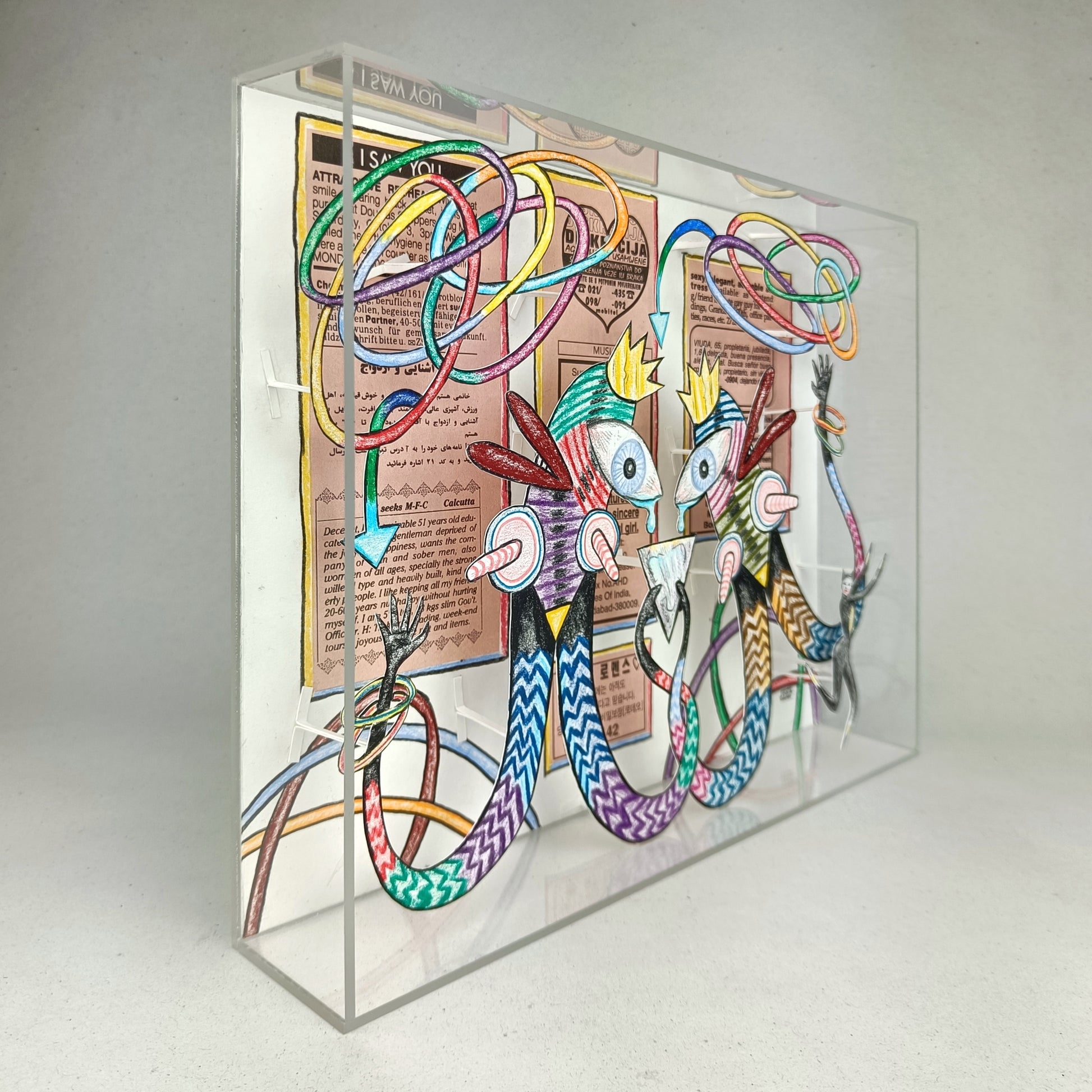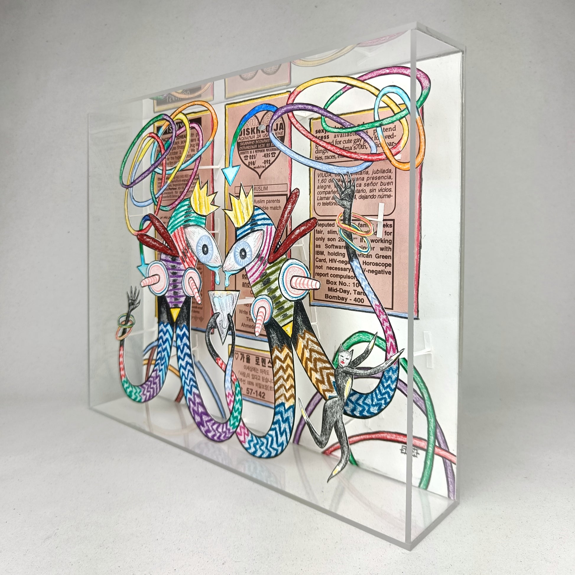 Ζωγραφικη με χρωματιστα μολυβια σε χαρτι bristol, κολαζ και κουτι πλεξιγλας.