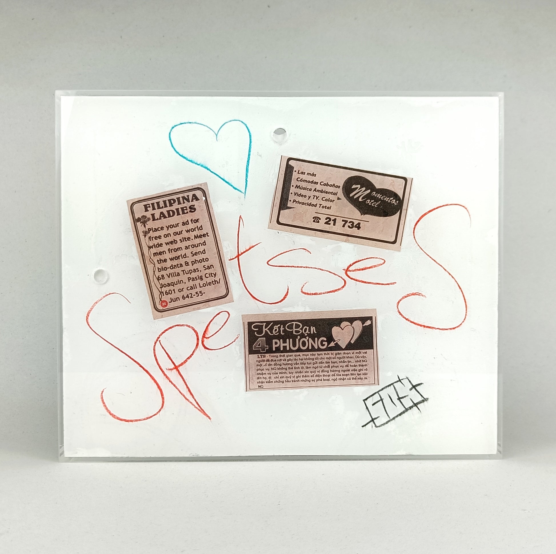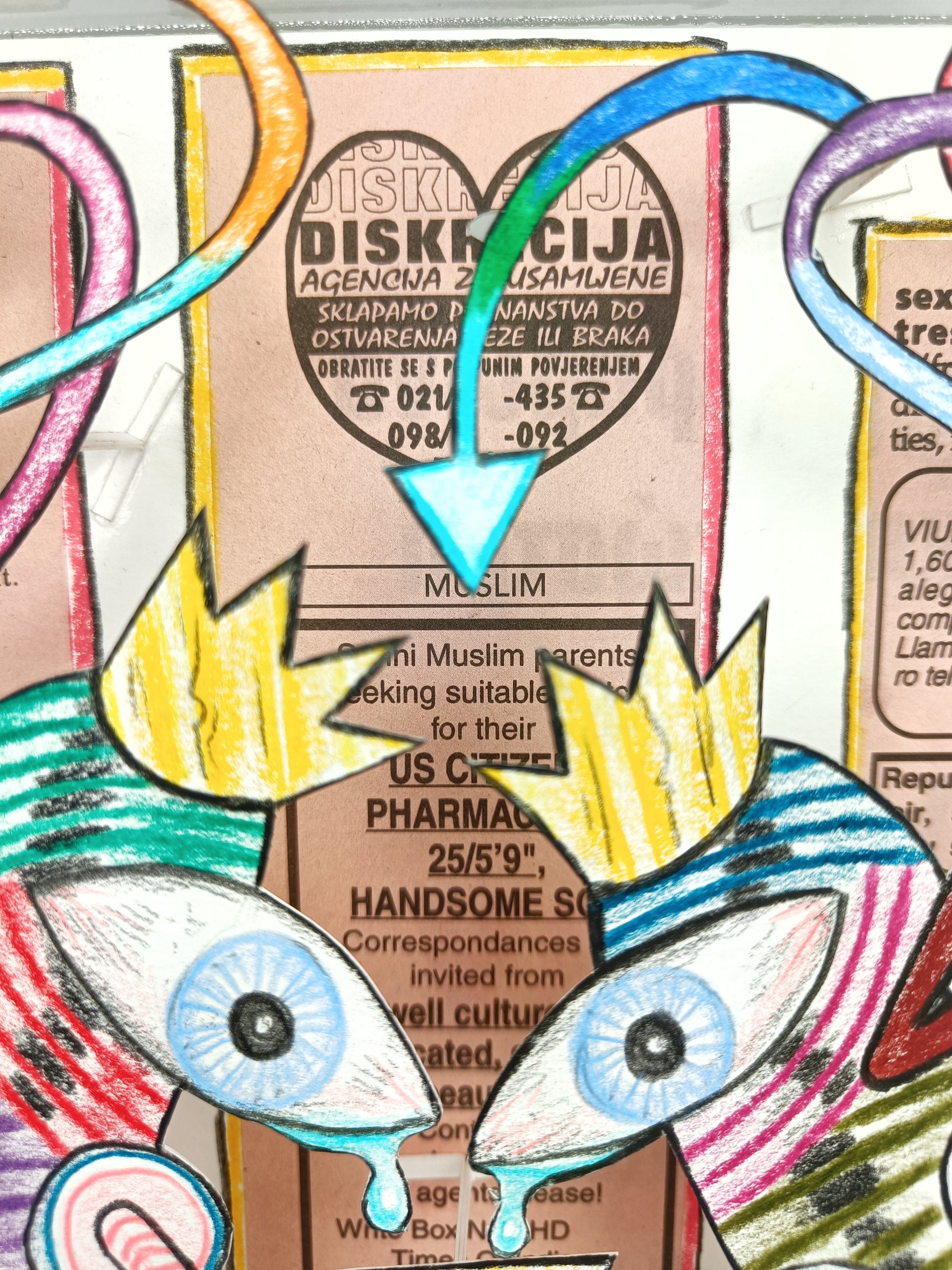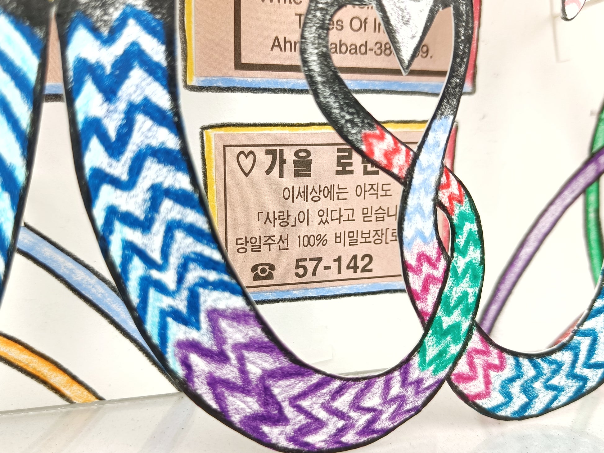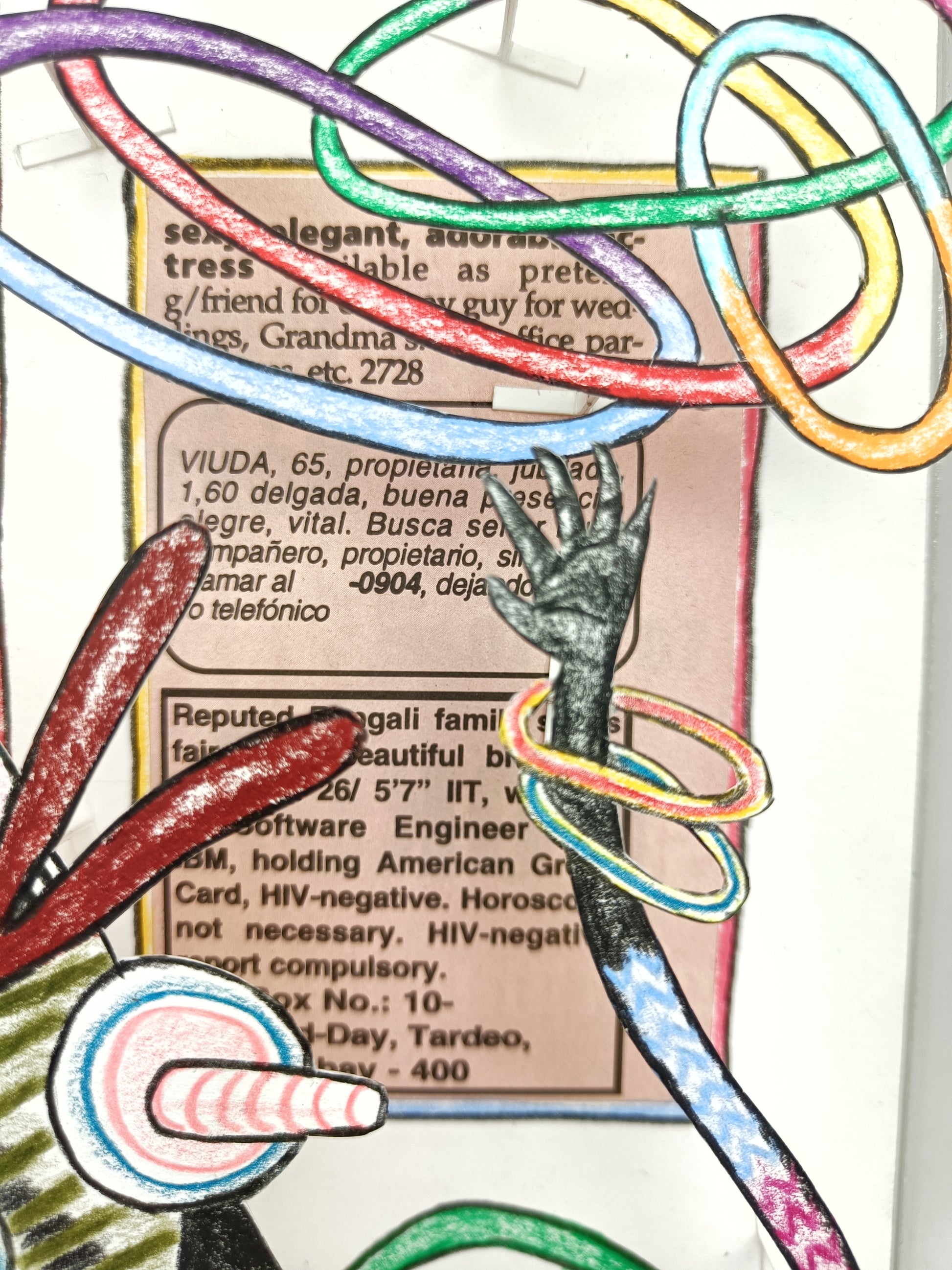 Ζωγραφικη με χρωματιστα μολυβια σε χαρτι bristol, κολαζ και κουτι πλεξιγλας.